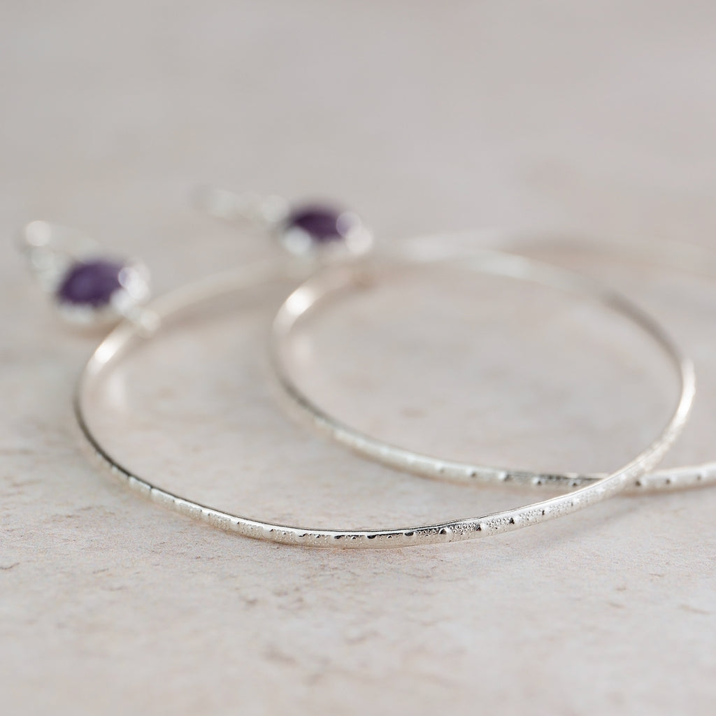 The sterling silver hoop is approximately 40mm in diameter with an 8mm sterling silver bezel set real semi precious Amethyst.