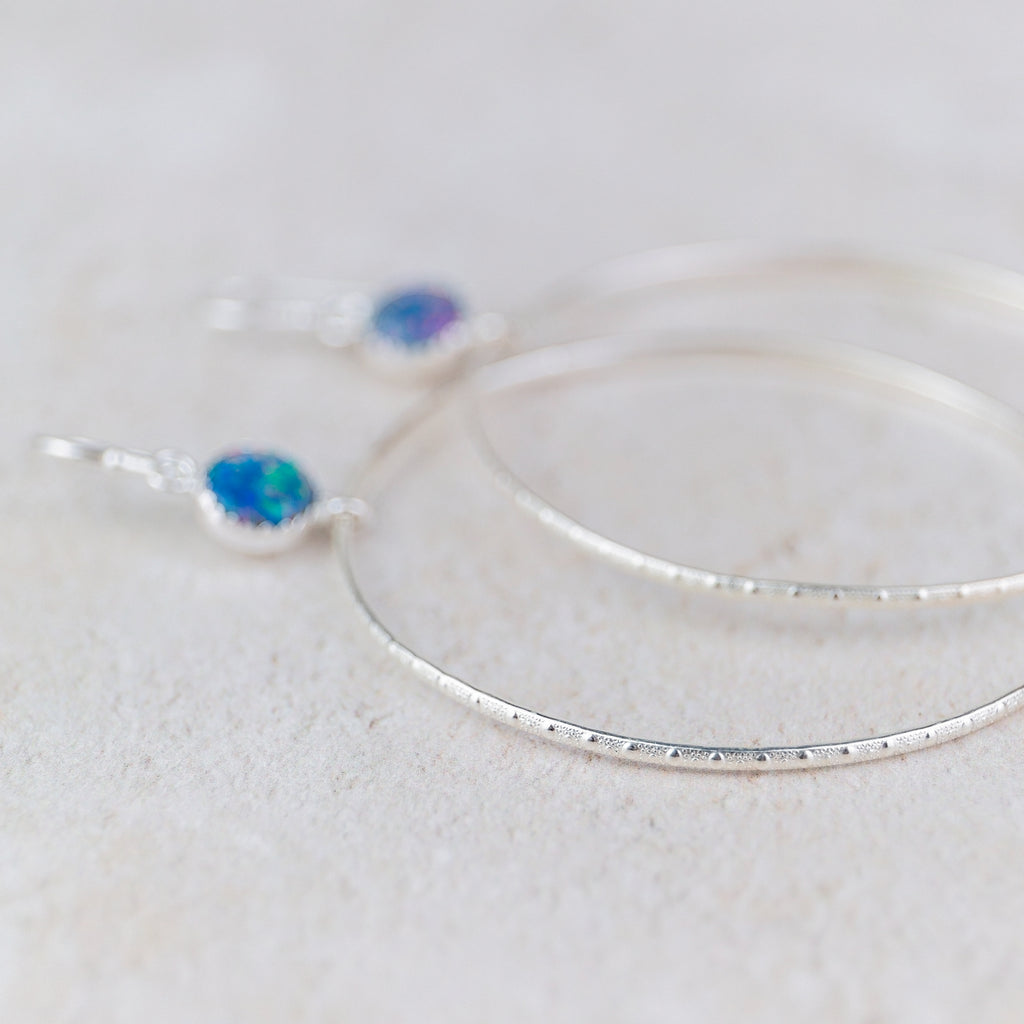 The sterling silver hoop is approx 40mm in diameter with an 8mm sterling silver bezel set real teal opalite.