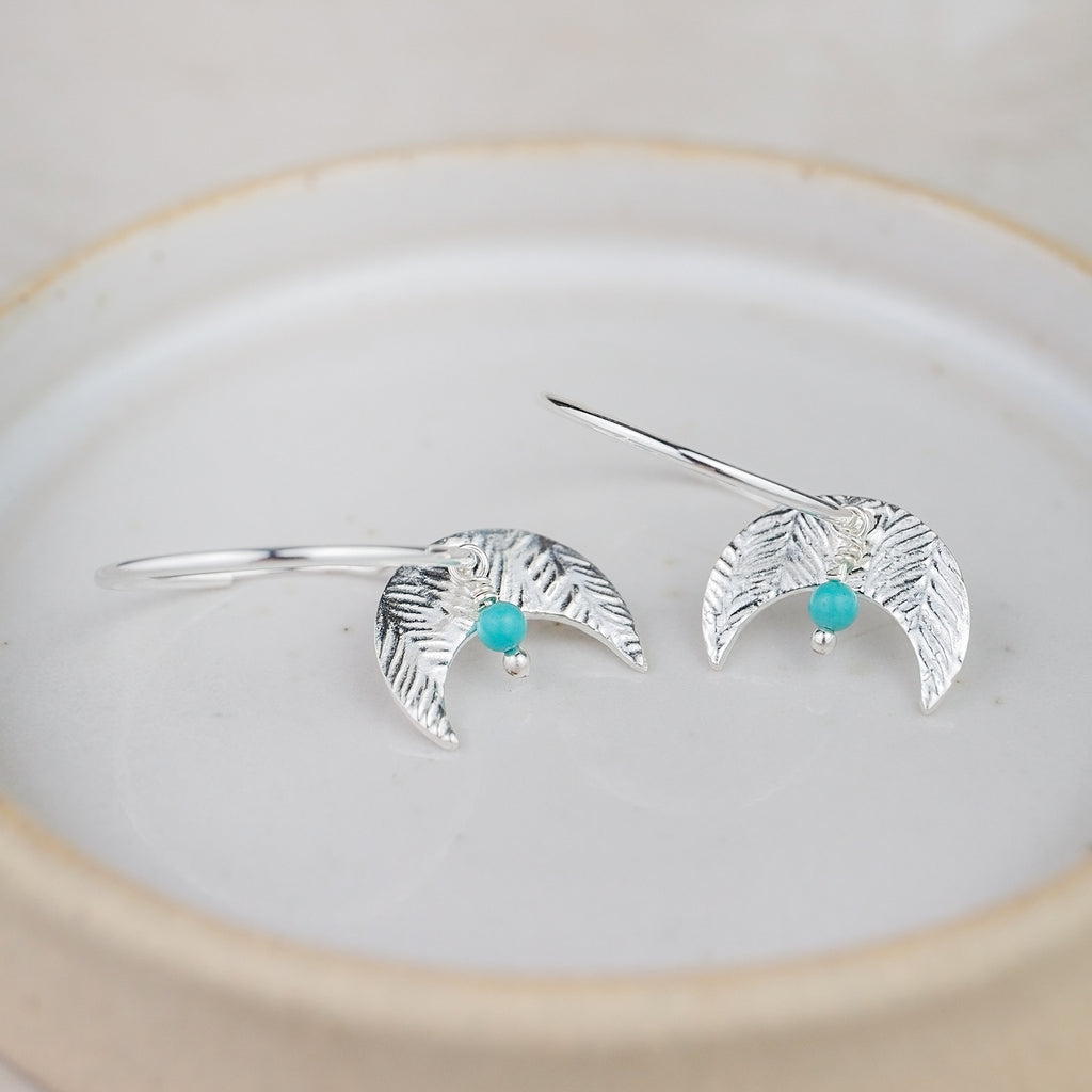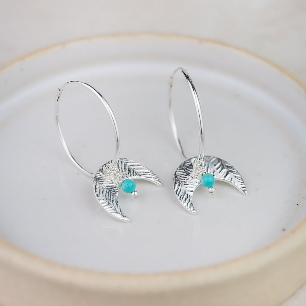 These lovely hoops are approximately 22mm in diameter, and finished with a 15mm textured moon and 3mm turquoise bead.