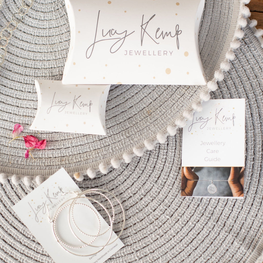 All of our sterling silver hoop earrings arrive on a Lucy Kemp Jewellery hoop card, wrapped in acid free tissue paper and presented in a Lucy Kemp Jewellery pillow box.