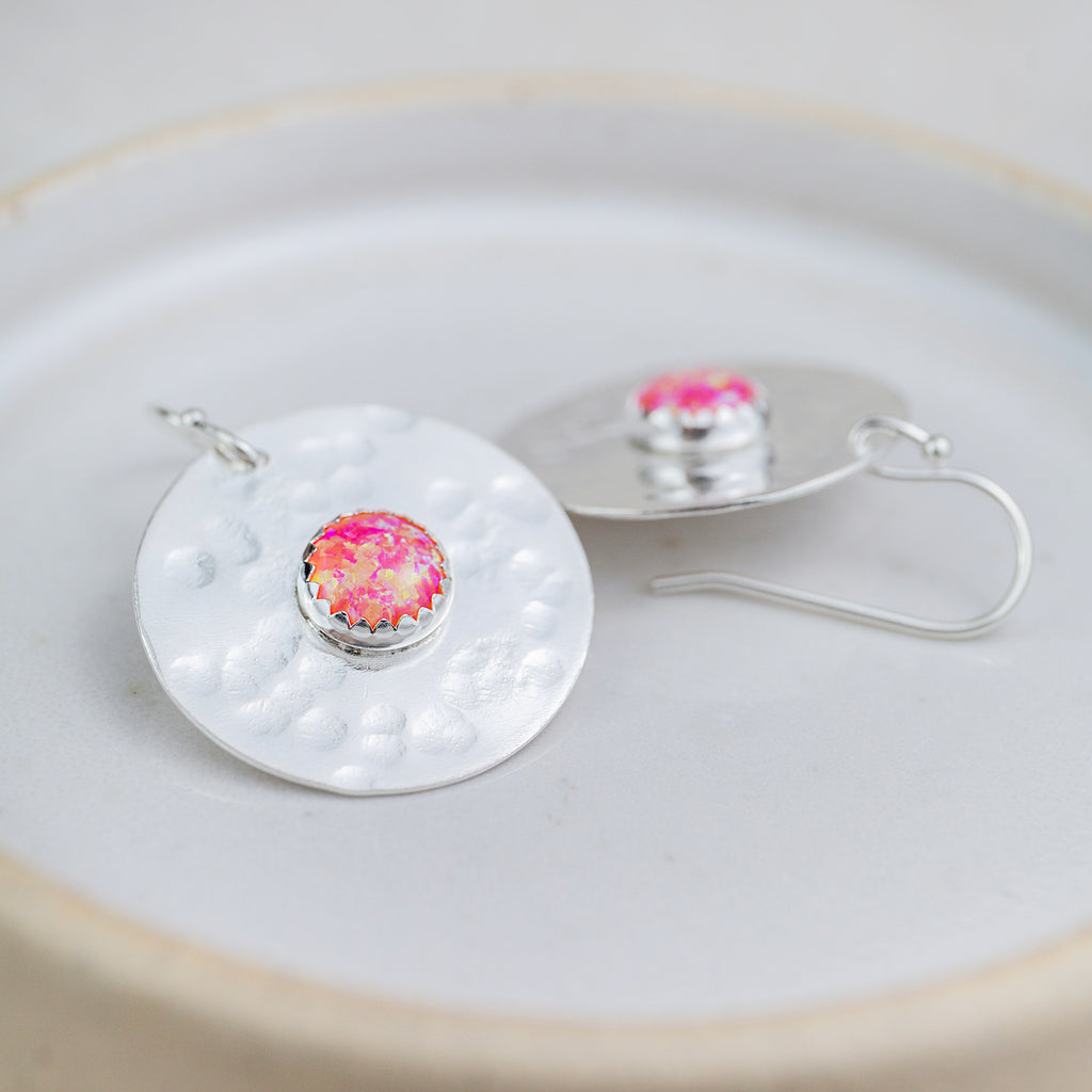 Handmade large sterling silver disc with real semi precious coral opalite stone set in the middle.