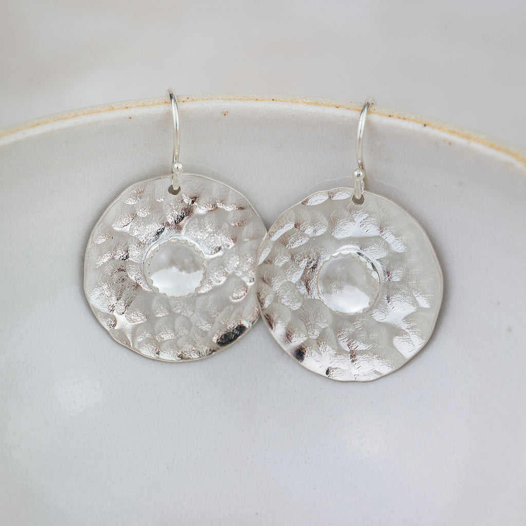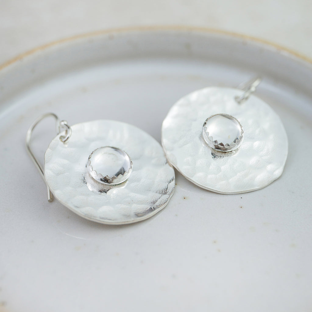 Handmade large sterling silver disc with a real semi precious Crystal Quartz stone set in the middle.