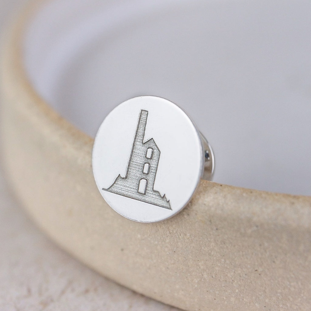 This sterling silver charm is approximately 15mm across has been soldered to a sterling silver pin. Featuring the iconic buildings of the past which are dotted all over Cornwall, secured with a sterling silver tie pin back.