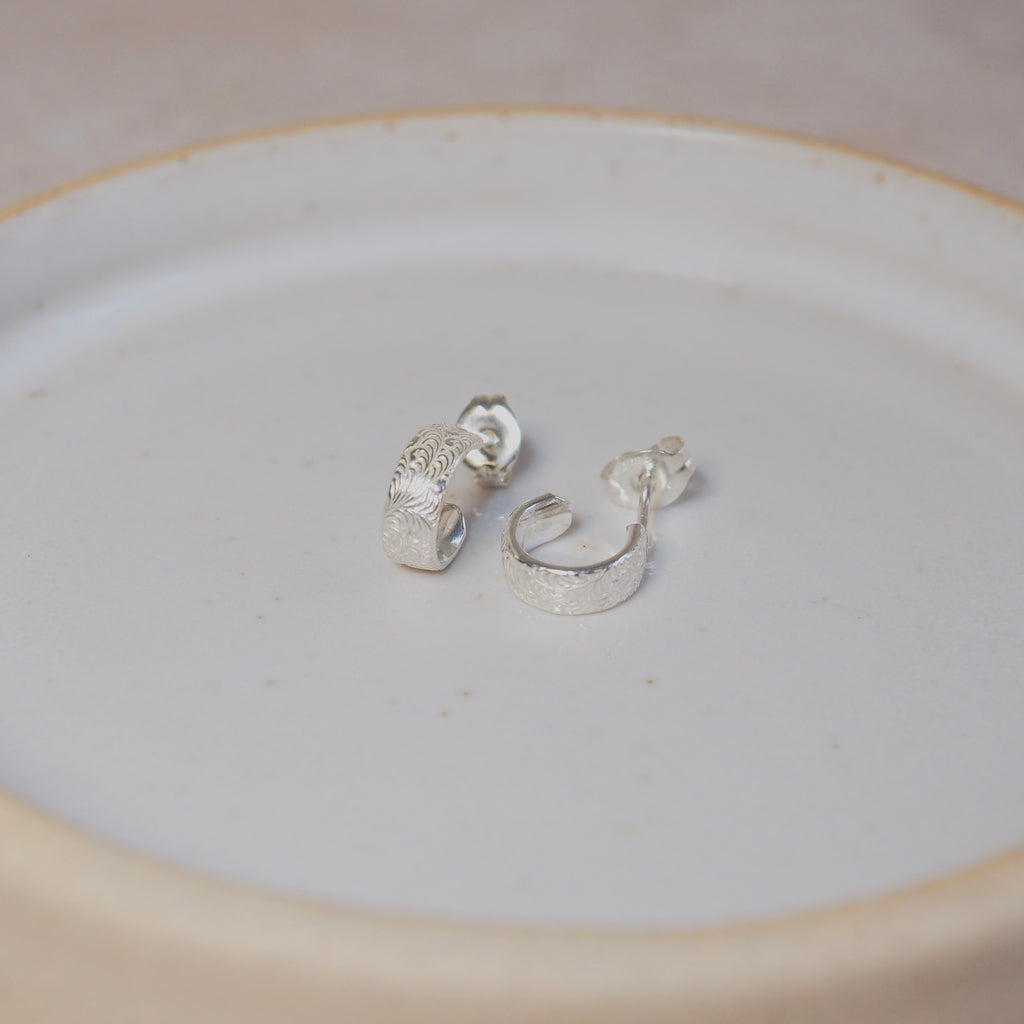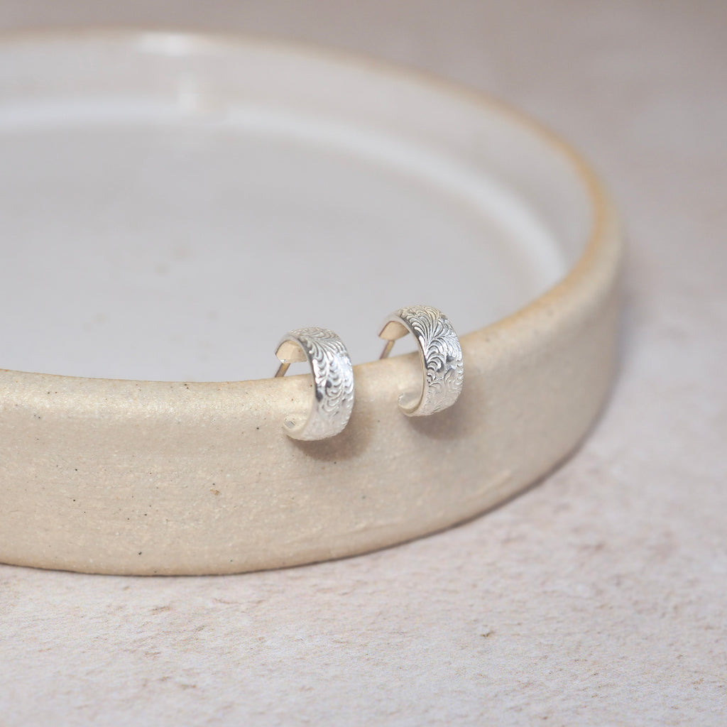 Round recycled sterling silver hoops. Each hoop is approximately 8mm in diameter and has a delicate lace texture to the front. A stud style hoop made for comfort.