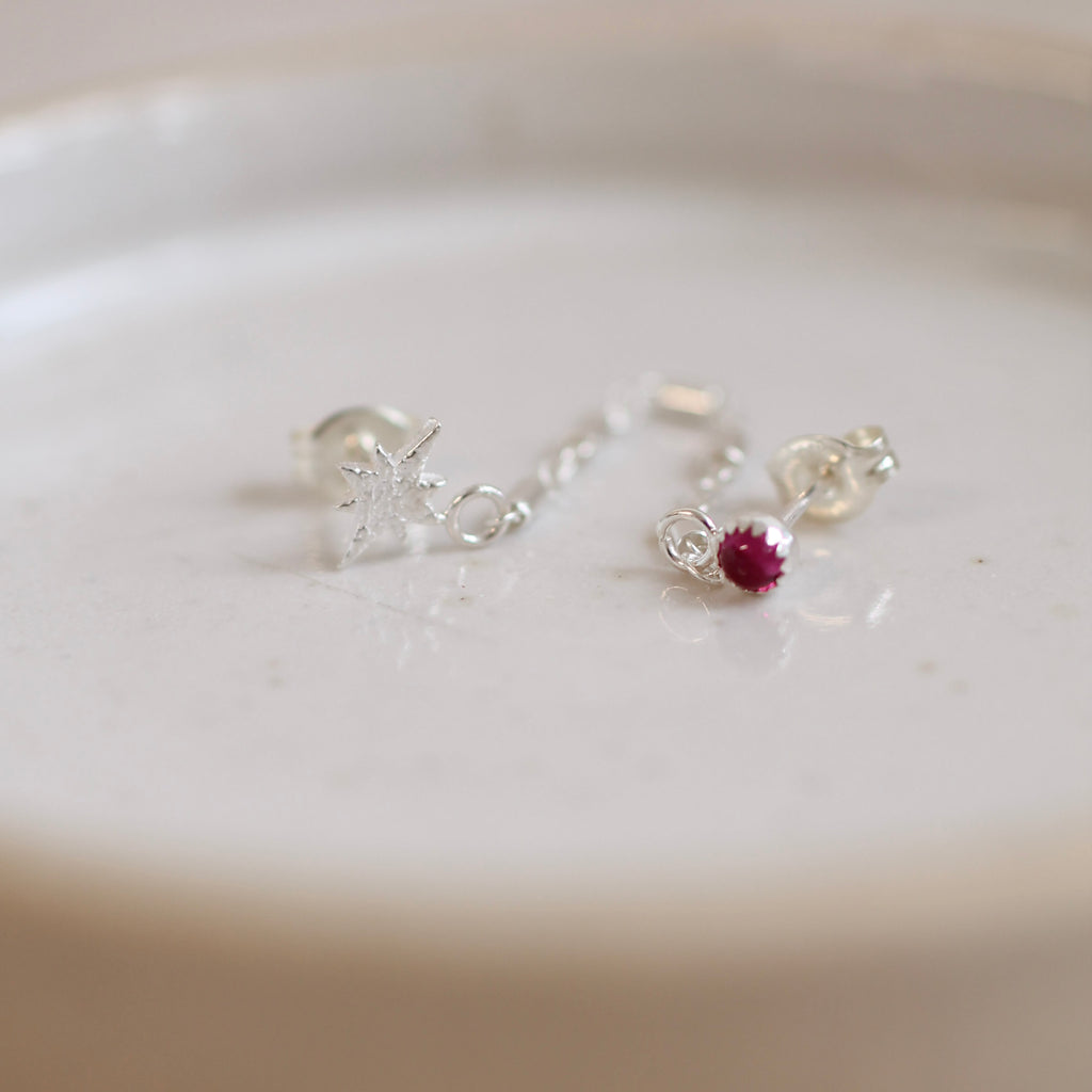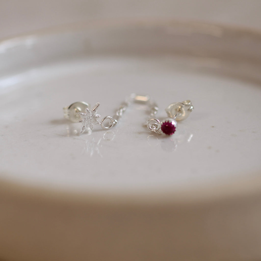 Handmade sterling silver starburst birthstone chained mini studs - a new take on our popular mini studs!