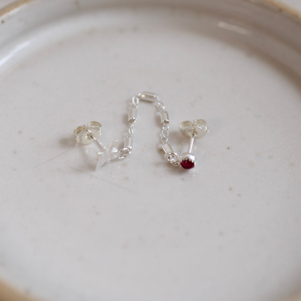 Each mini stud is approximately 3mm in size, and joined by a tube chain. The birthstone is 3mm in size set in sterling silver. Please note that this is a single earring and not a pair.