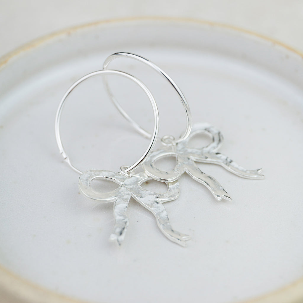 These lovely bow hoops are approximately 22mm in diameter, and finished with a 20mm long sterling silver hanging bow.
