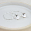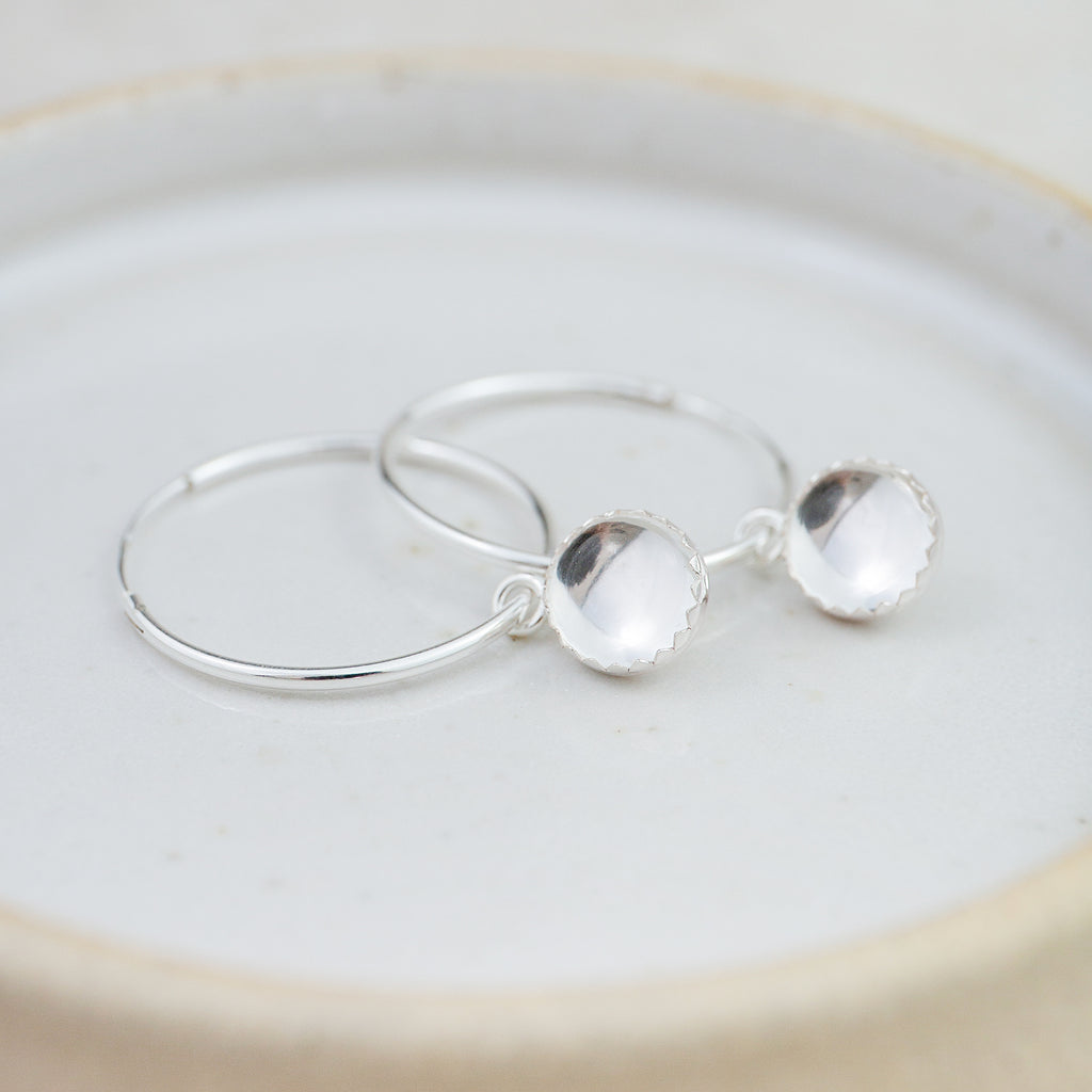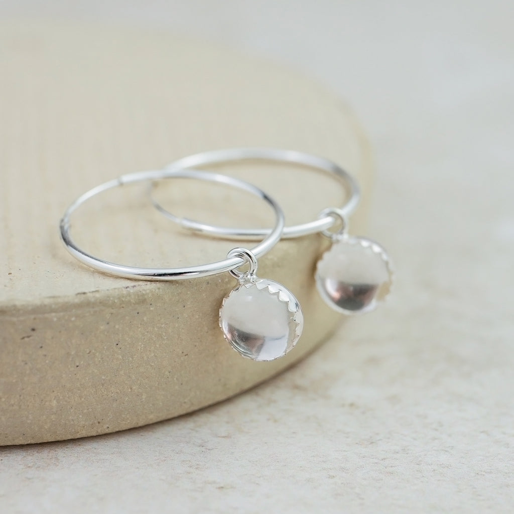 Handmade sterling silver hoops with a real semi precious Crystal Quartz set in a sterling silver bezel drop charm.