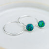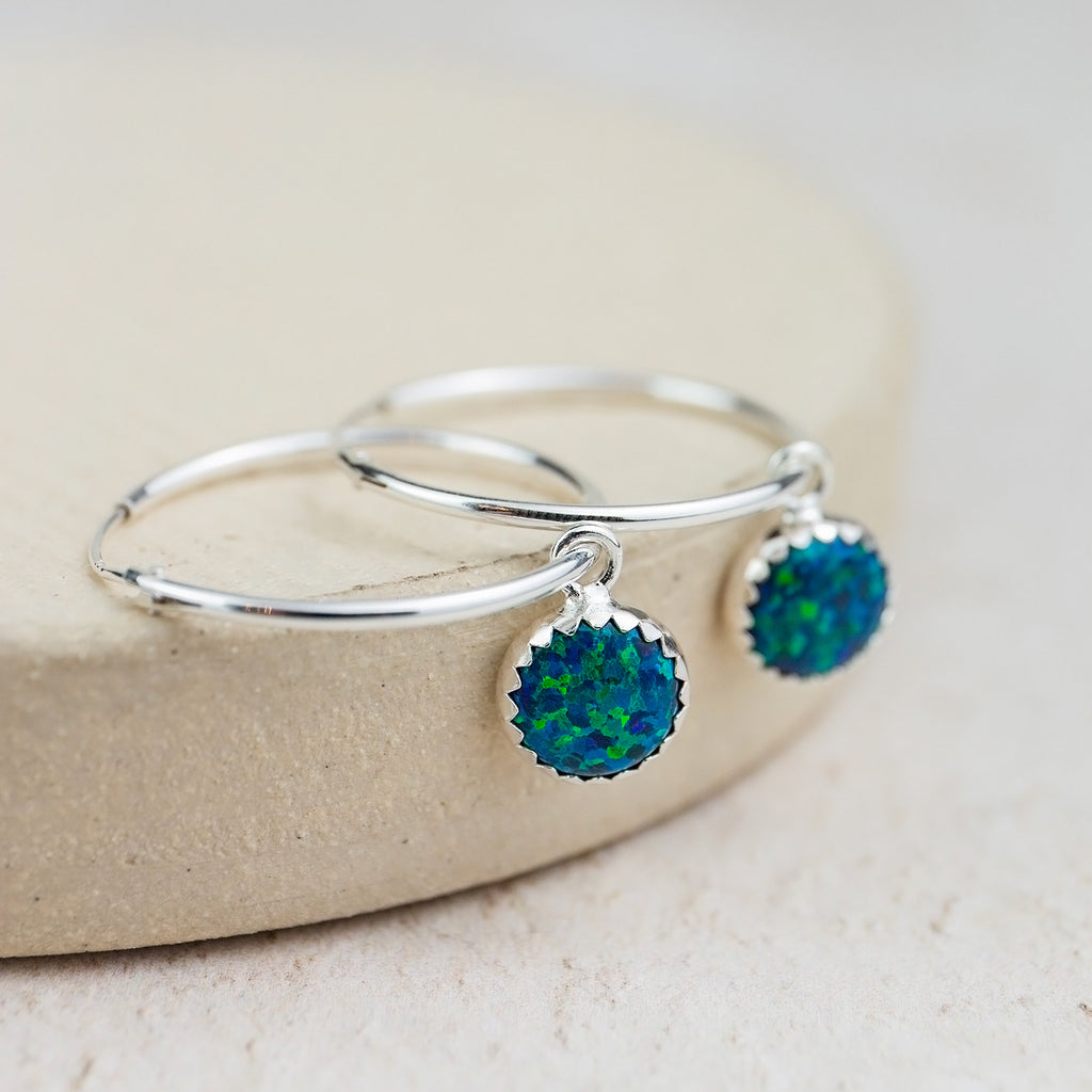 Handmade sterling silver hoops with a real semi precious Green Opalite set in a sterling silver bezel drop charm.