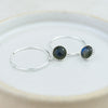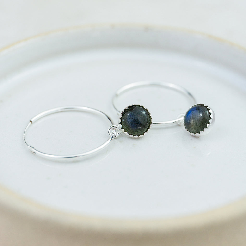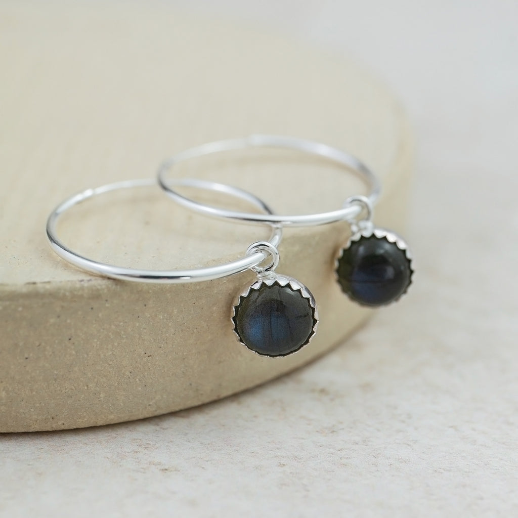 Handmade sterling silver hoops with a real semi precious Labradorite set in a sterling silver bezel drop charm.