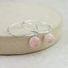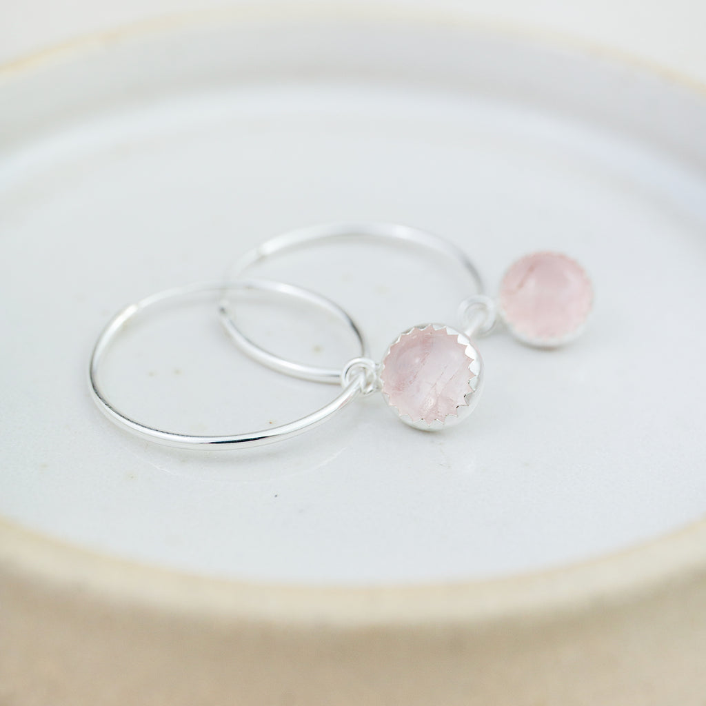 Handmade sterling silver hoops with a real semi precious Rose Quartz set in a sterling silver bezel drop charm.