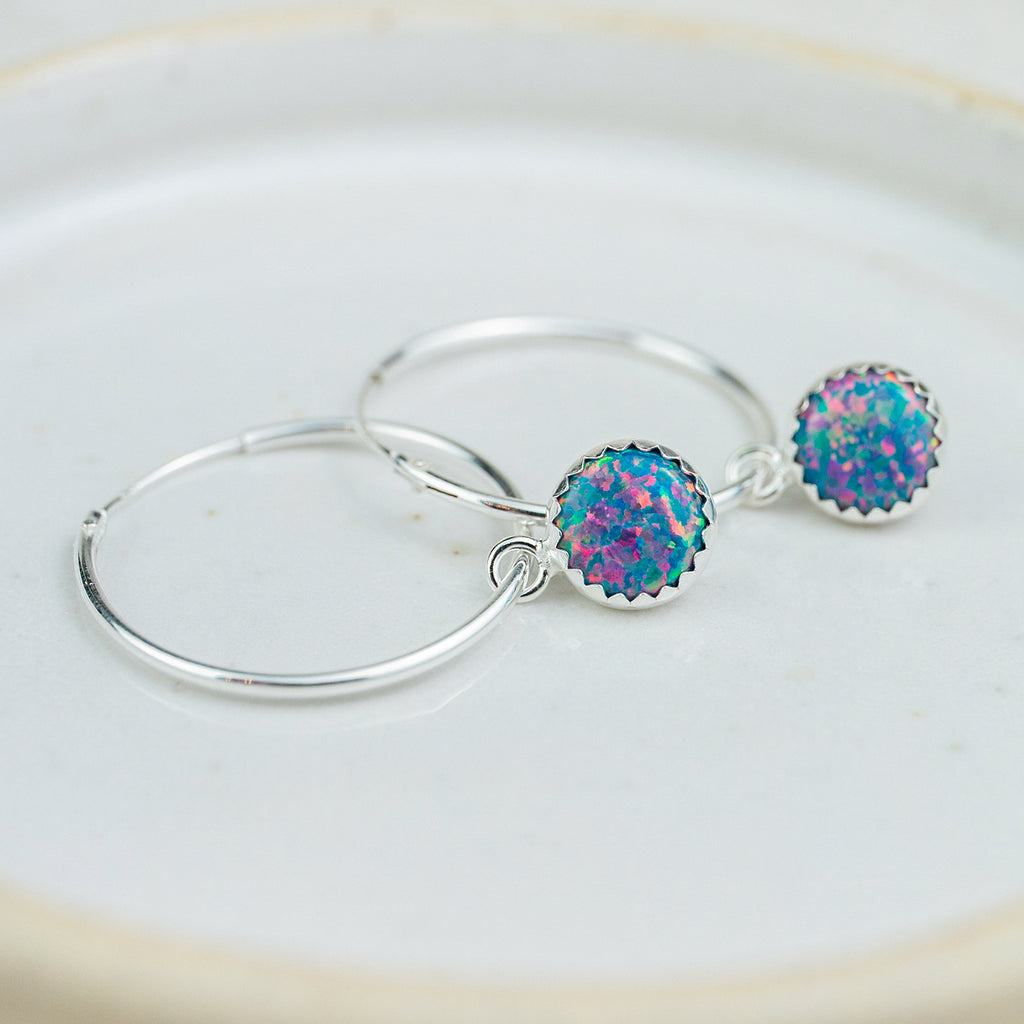Handmade sterling silver hoops with a real semi precious Teal Opalite set in a sterling silver bezel drop charm.