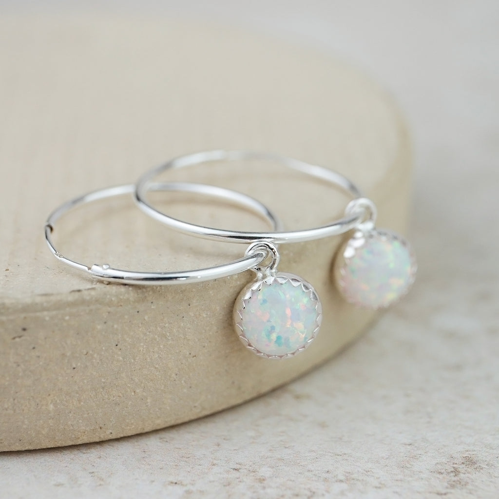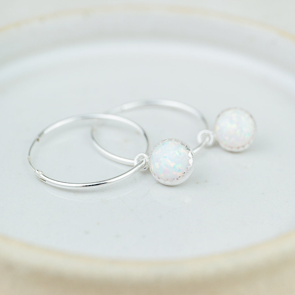 Handmade sterling silver hoops with a real semi precious White Opalite set in a sterling silver bezel drop charm.