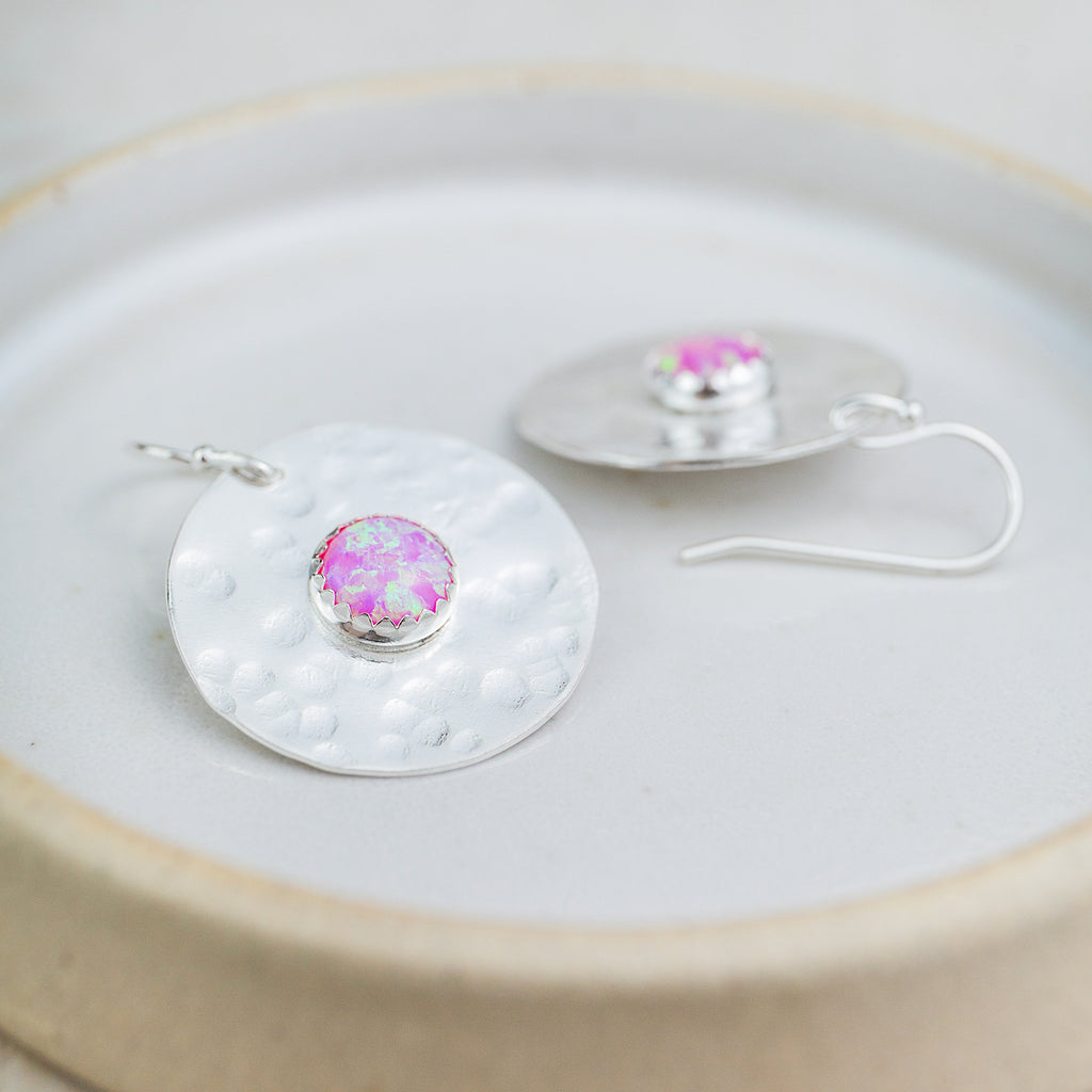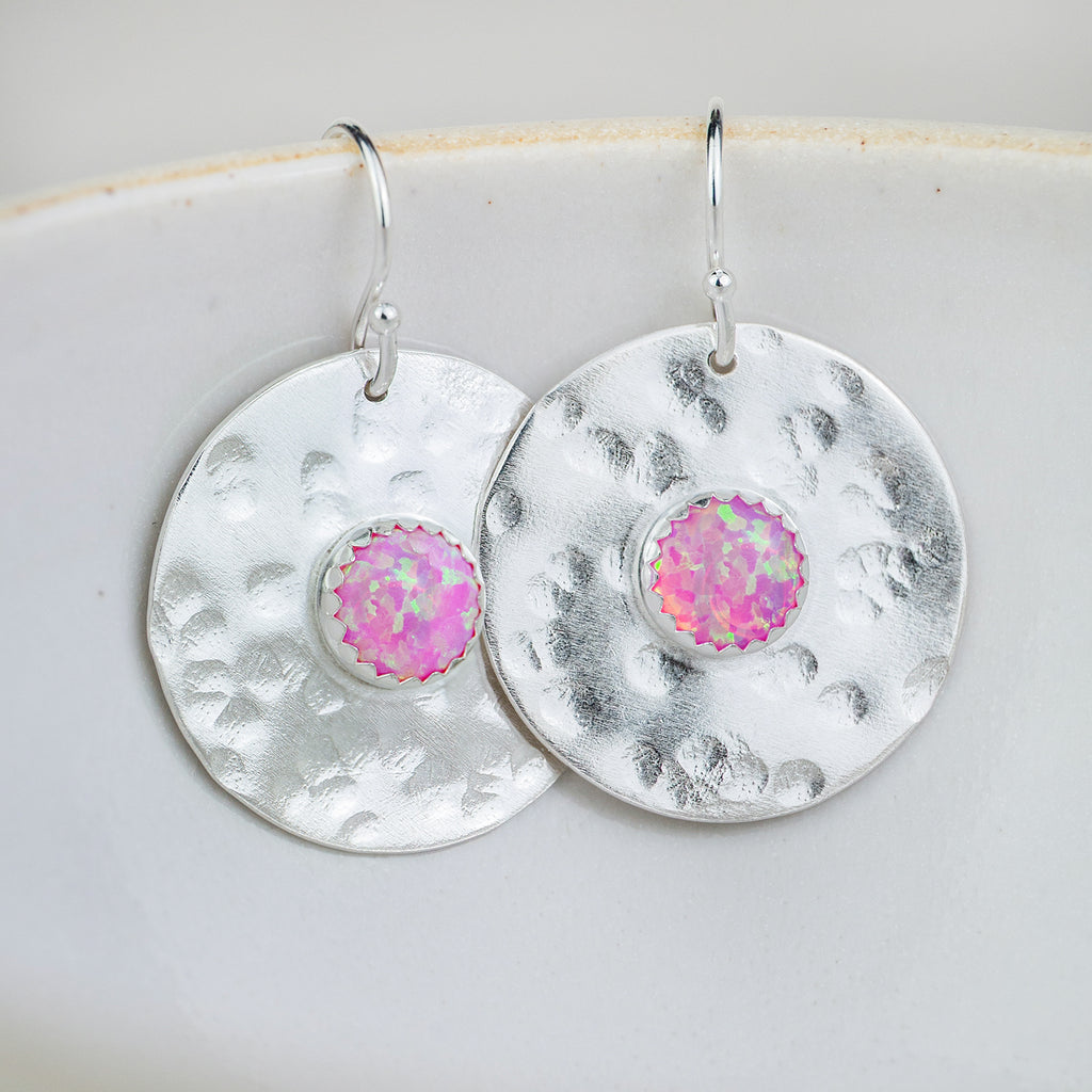 Handmade large sterling silver disc with real semi precious pink opalite stone set in the middle.