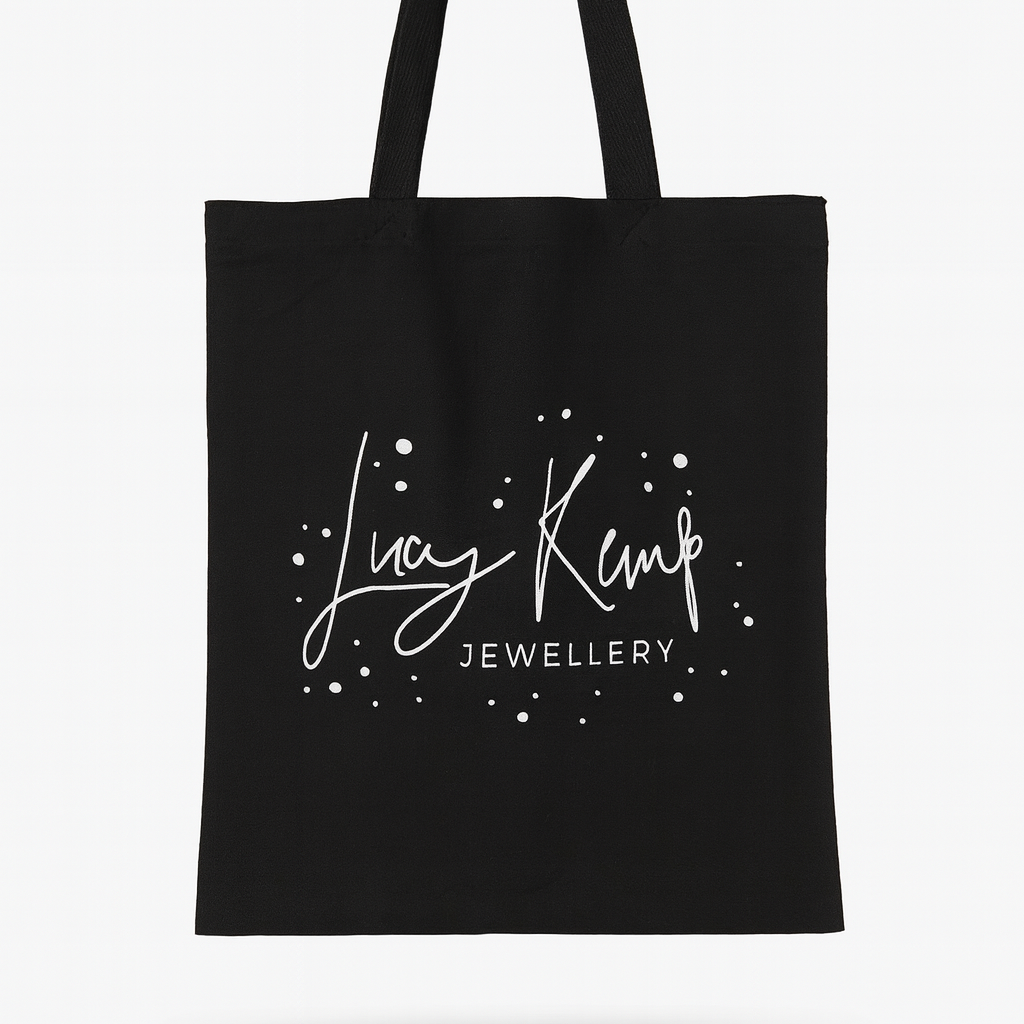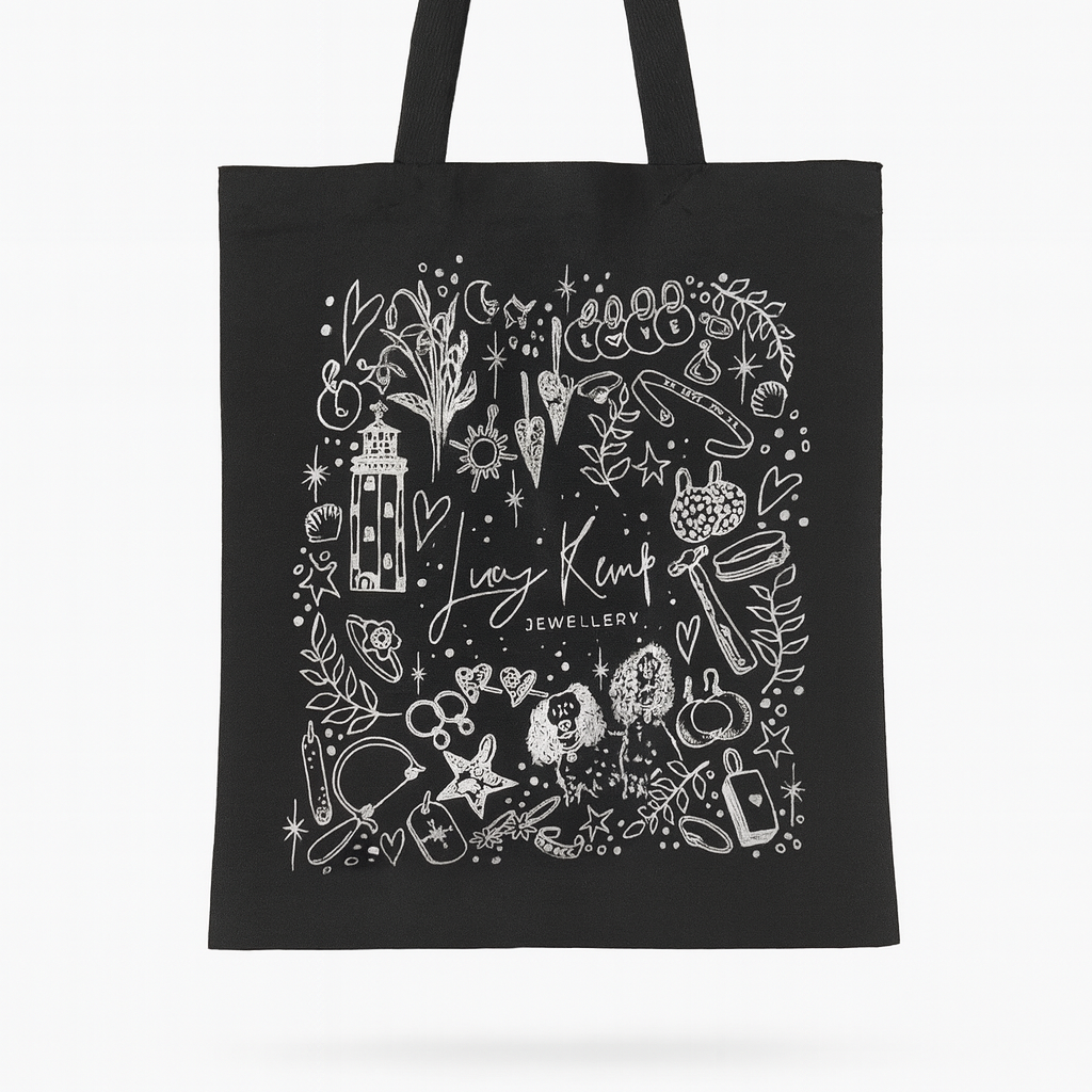 A lovely, spacious tote bag featuring a branded illustration on one side, and the Lucy Kemp Jewellery logo to the other side.