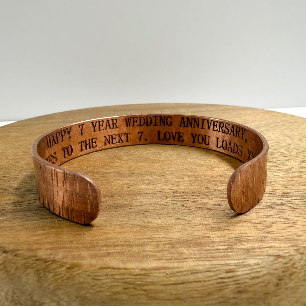 This copper personalised cuff is handmade from copper wire with a woodgrain textured finish. It can be personalised with engraving with names or a phrase in upper case lettering on the inside making an extra special, thoughtful gift.