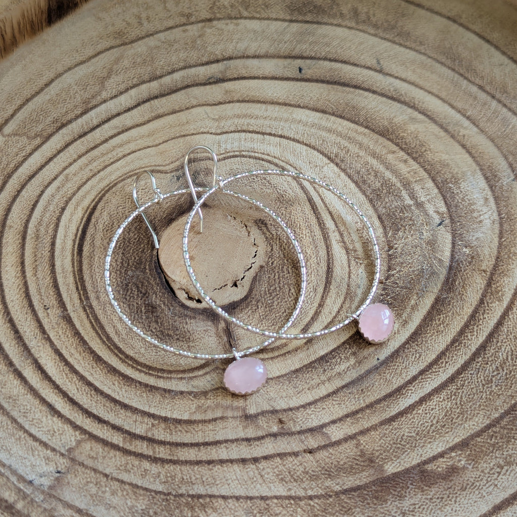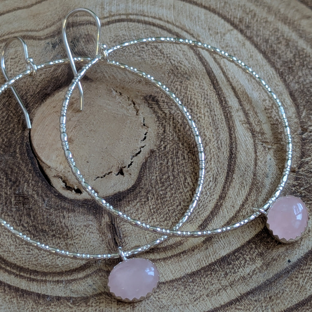 Sale - Handmade sterling silver gemstone textured hoop earrings with rose quartz.