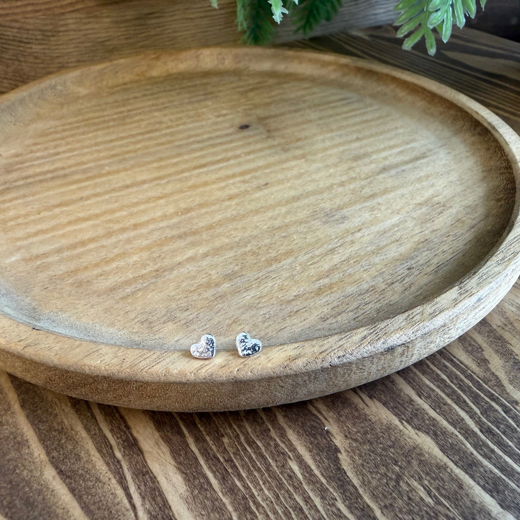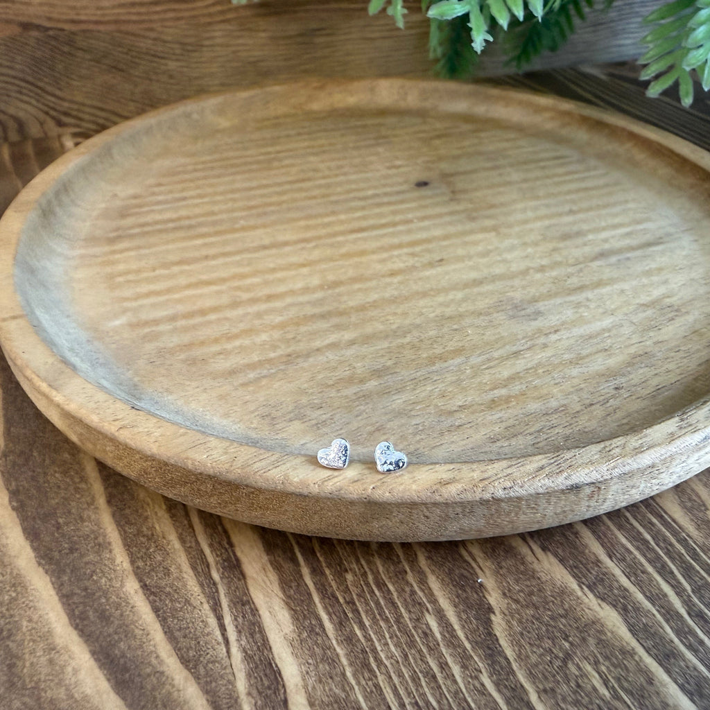 Handmade sterling silver heart studs are hand cut and delicately textured and are perfect for everyday wear.