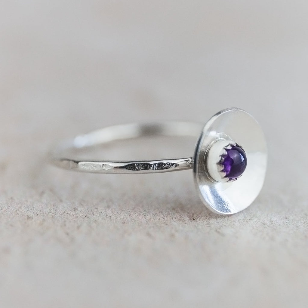 This delicate handmade ring has a stunning semi precious amethyst stone set in the centre. Eye-catching and impactful.