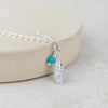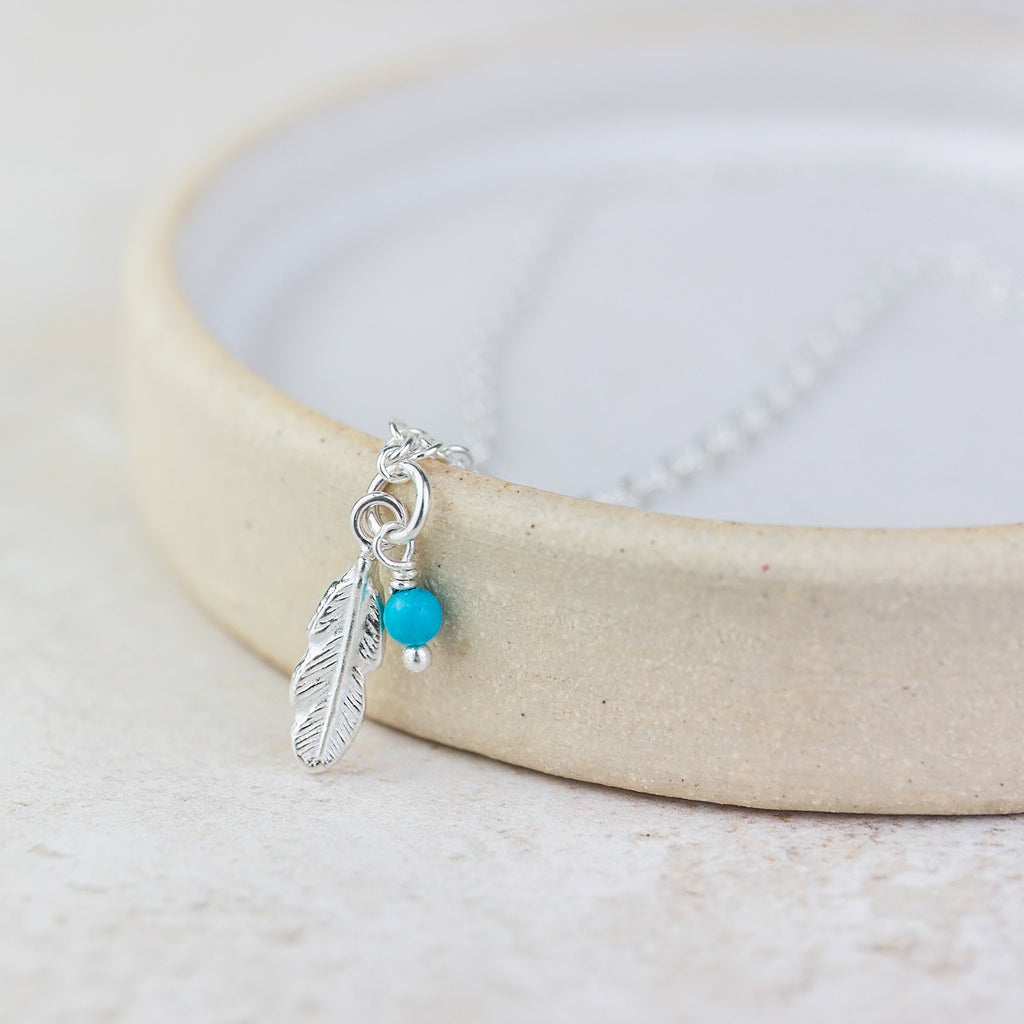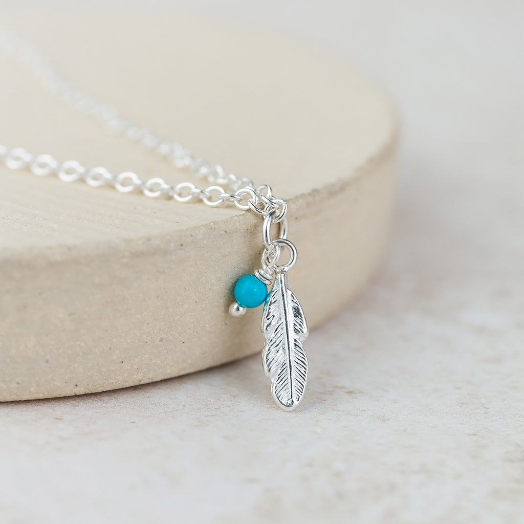 This beautiful sterling silver anklet has one small 15mm feather charm and a 3mm turquoise bead.