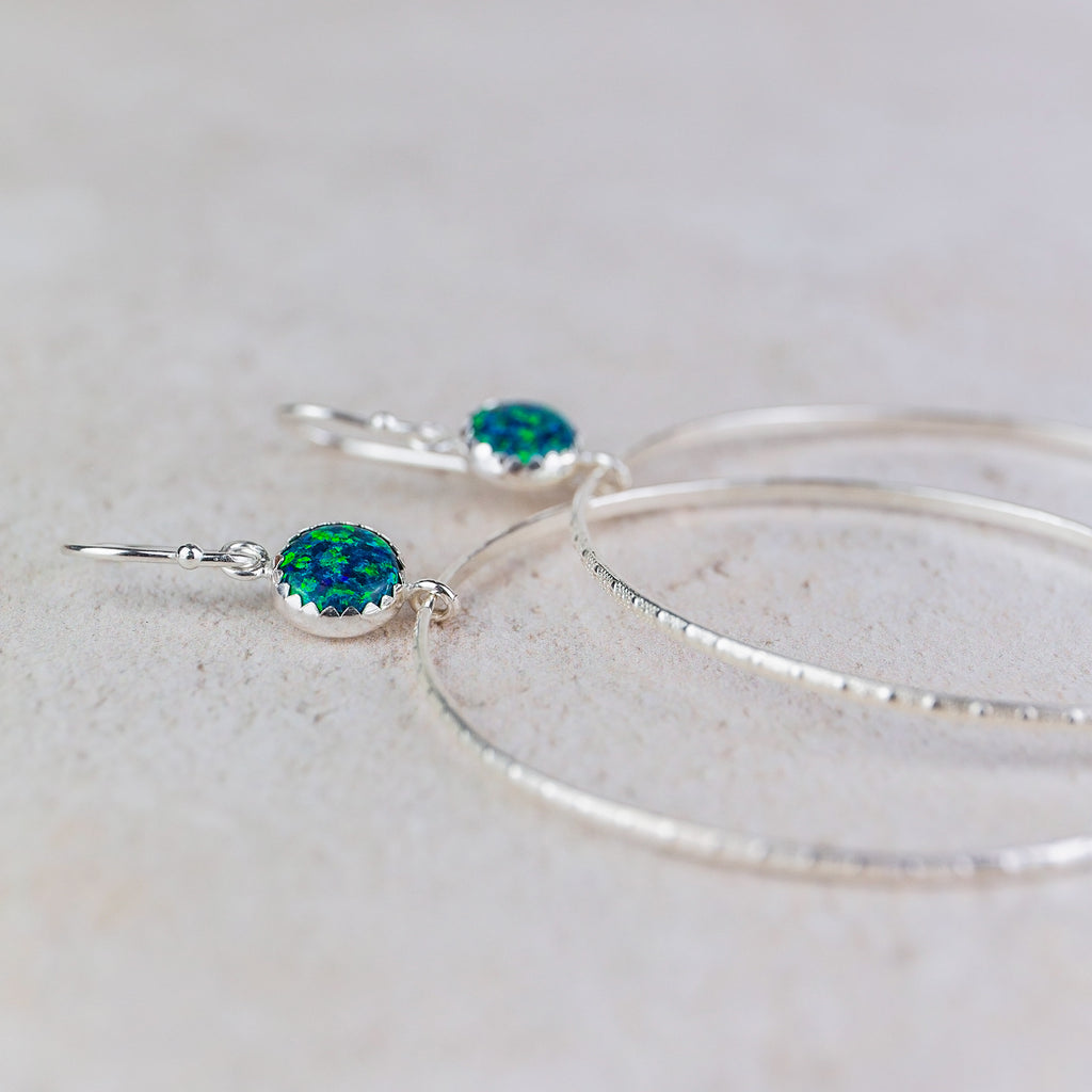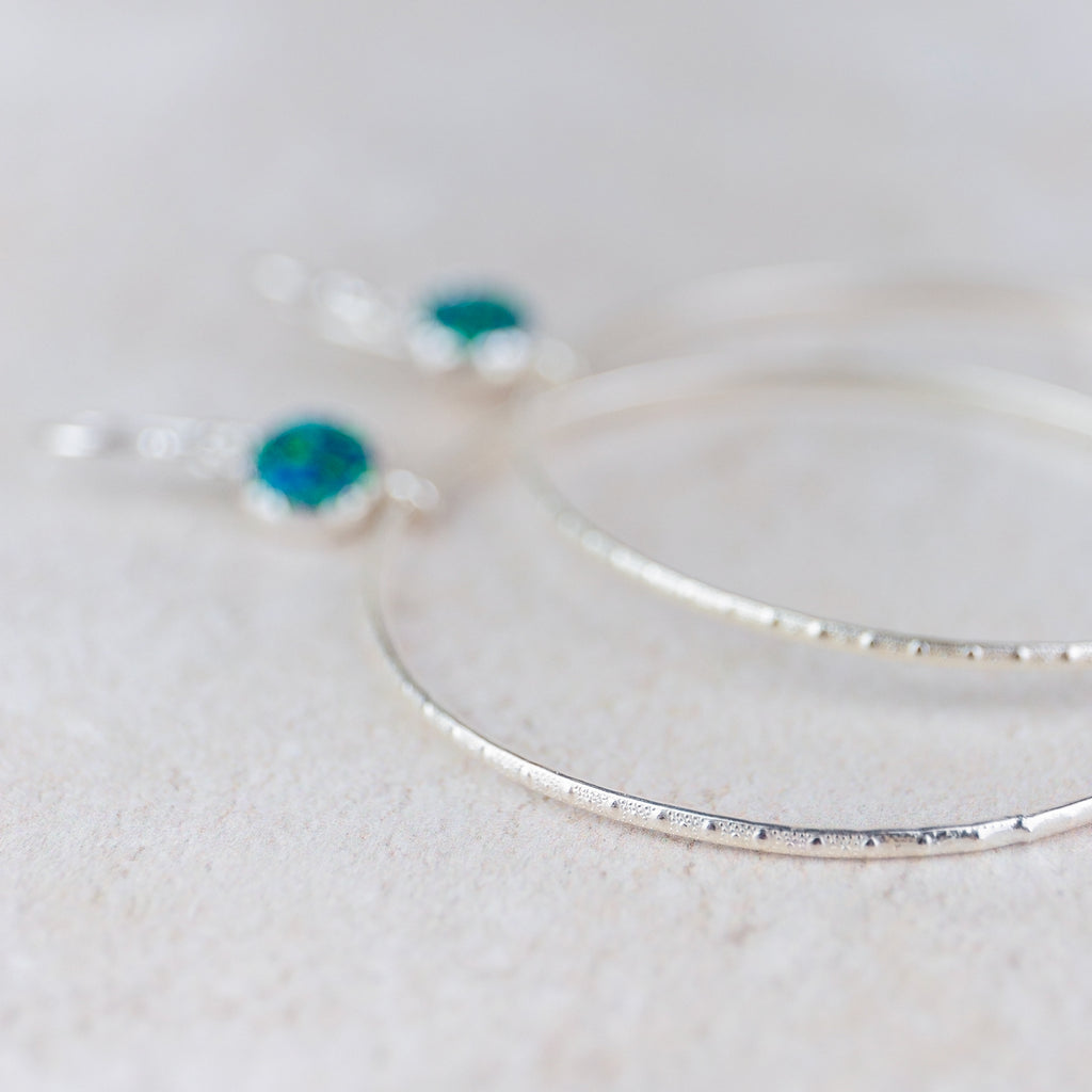 The sterling silver hoop is approx 40mm in diameter with an 8mm sterling silver bezel set real green opalite.