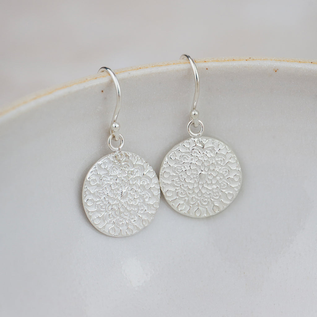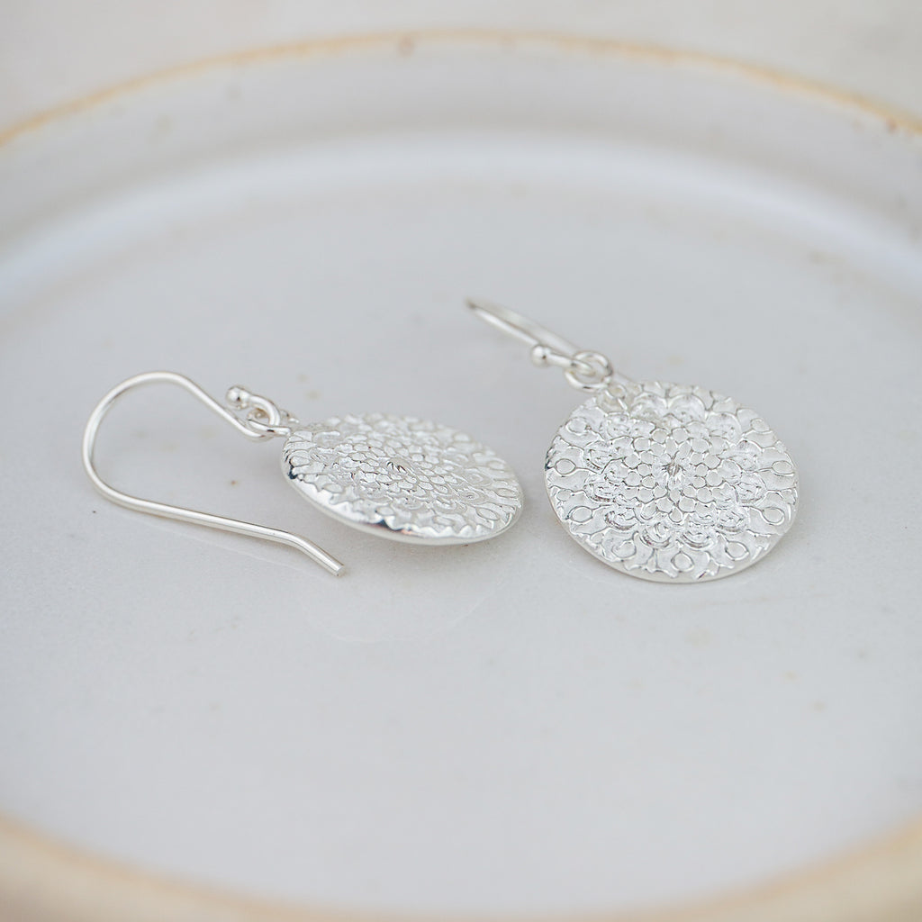 These lovely mandala earrings are approximately 15mm in diameter, and finished with a mandala texture to the front. The sterling silver ear wire is 1mm thick.