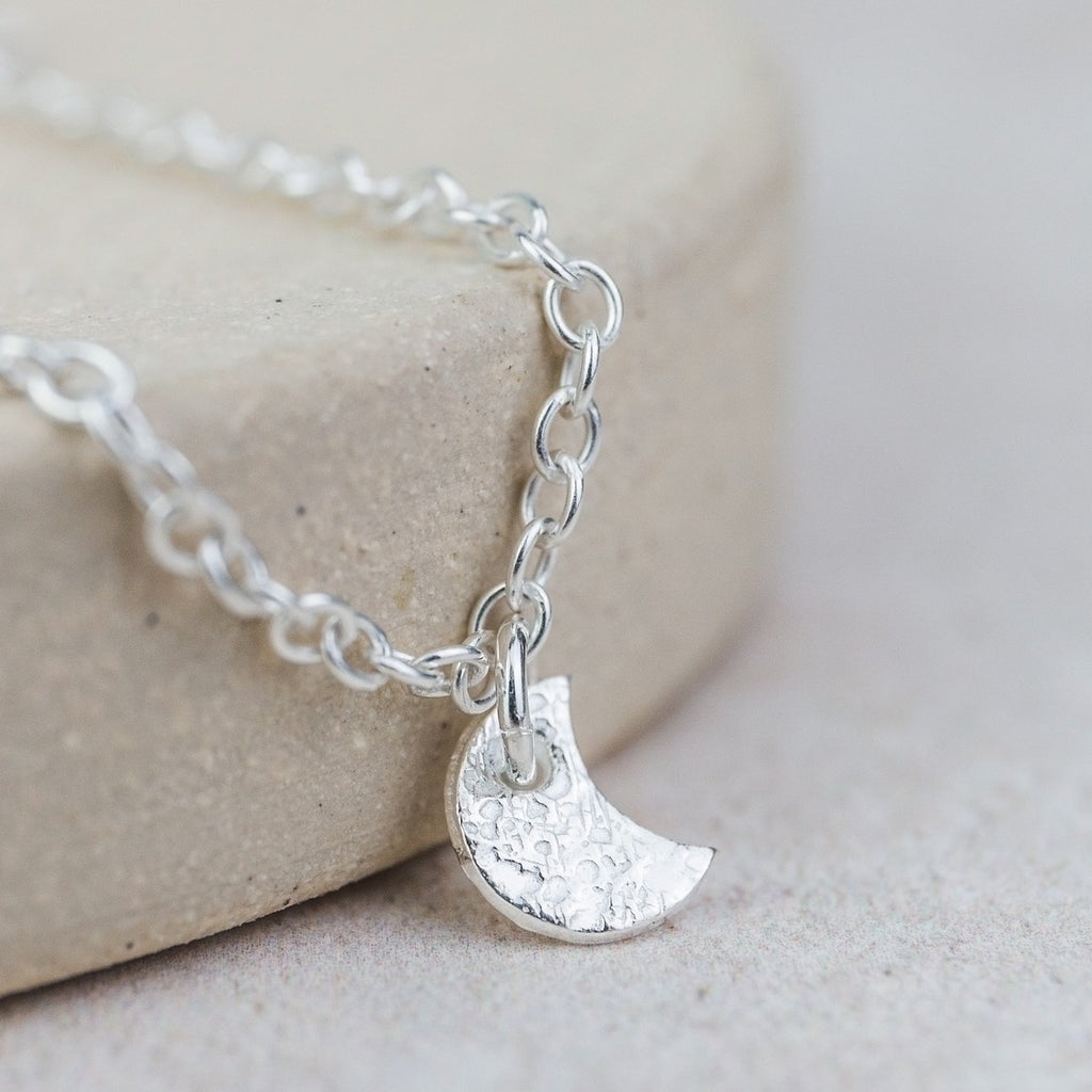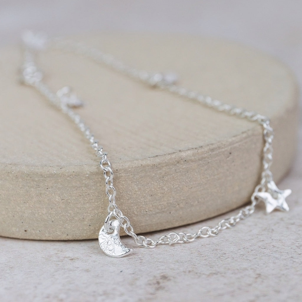 Handmade sterling silver moon and star charm anklet.