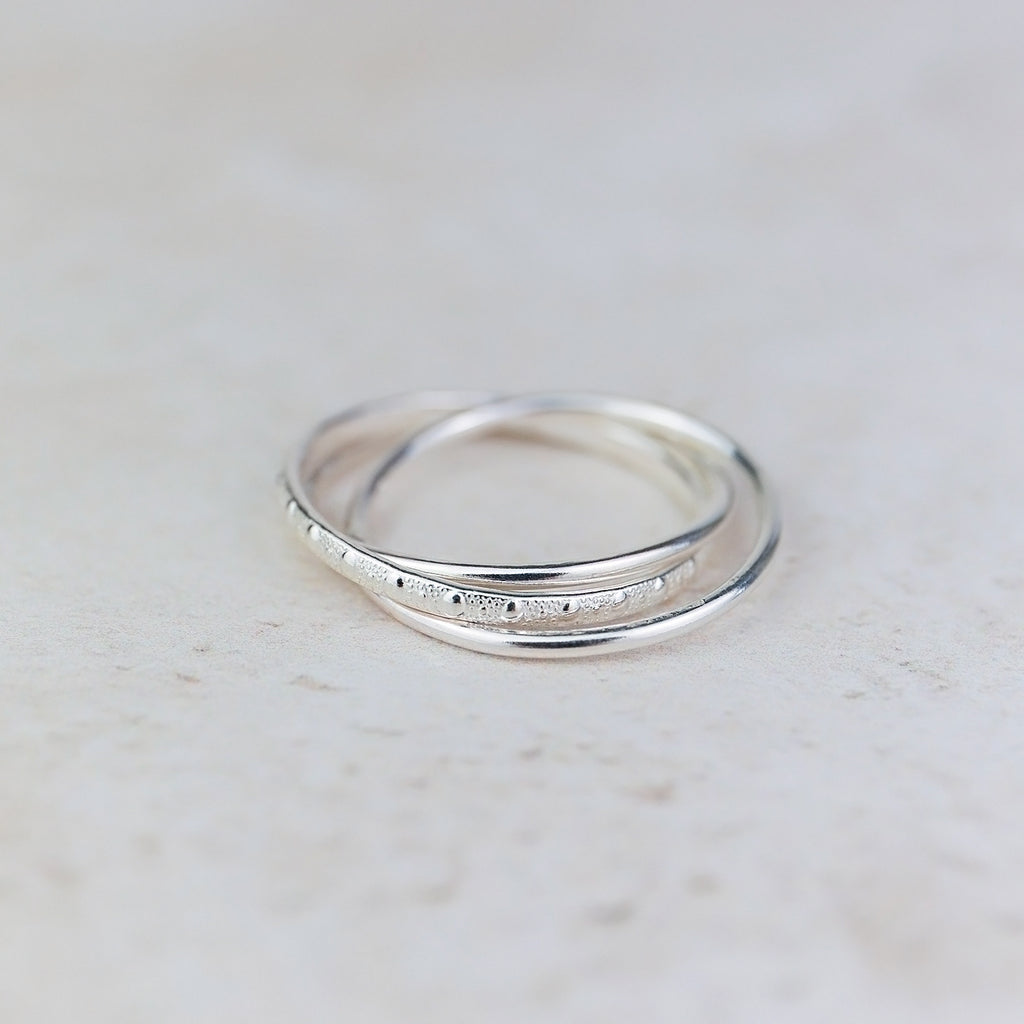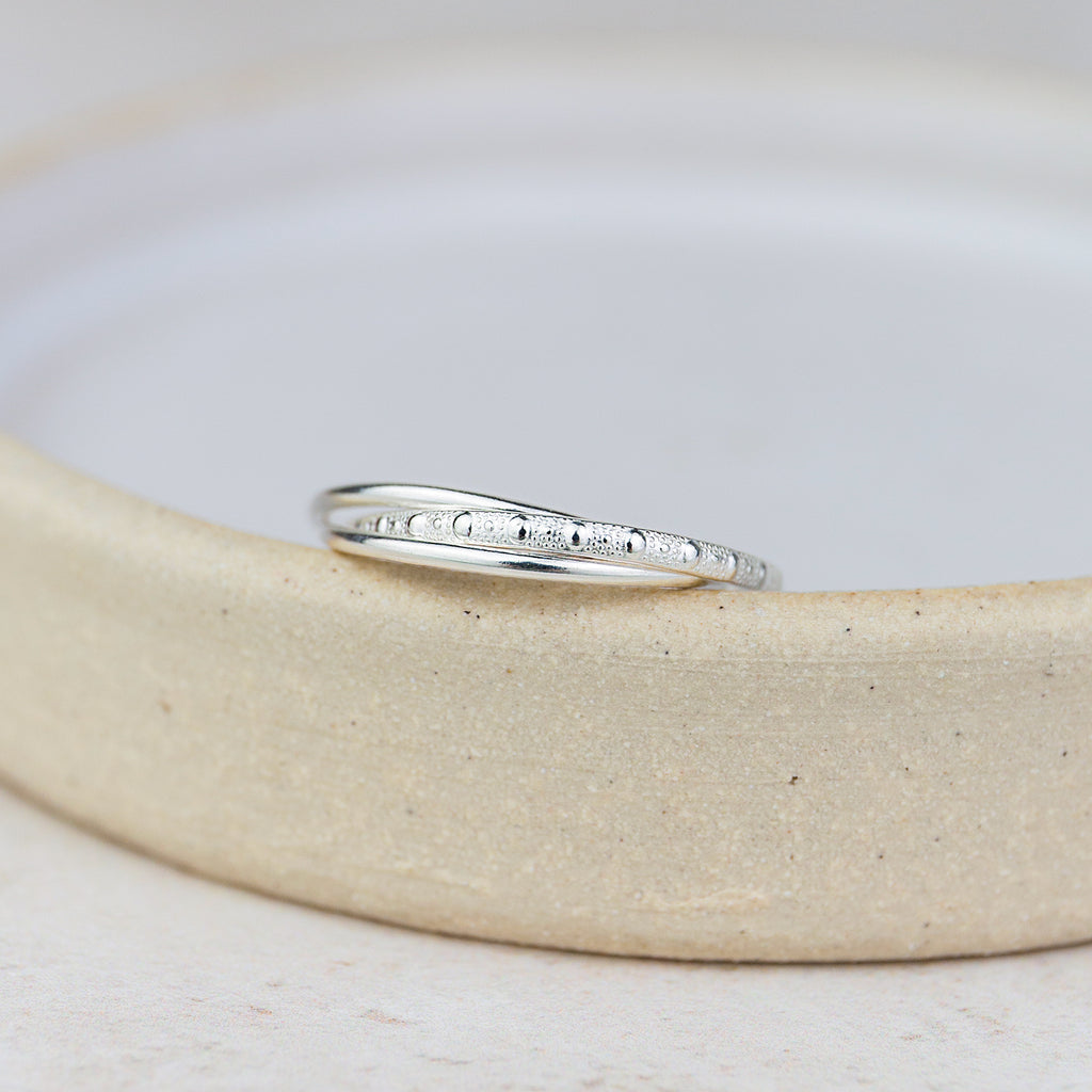 Our sterling silver thin stacking rings come in a small (UK size K), medium (UK size N) and large (UK size P).