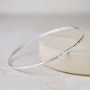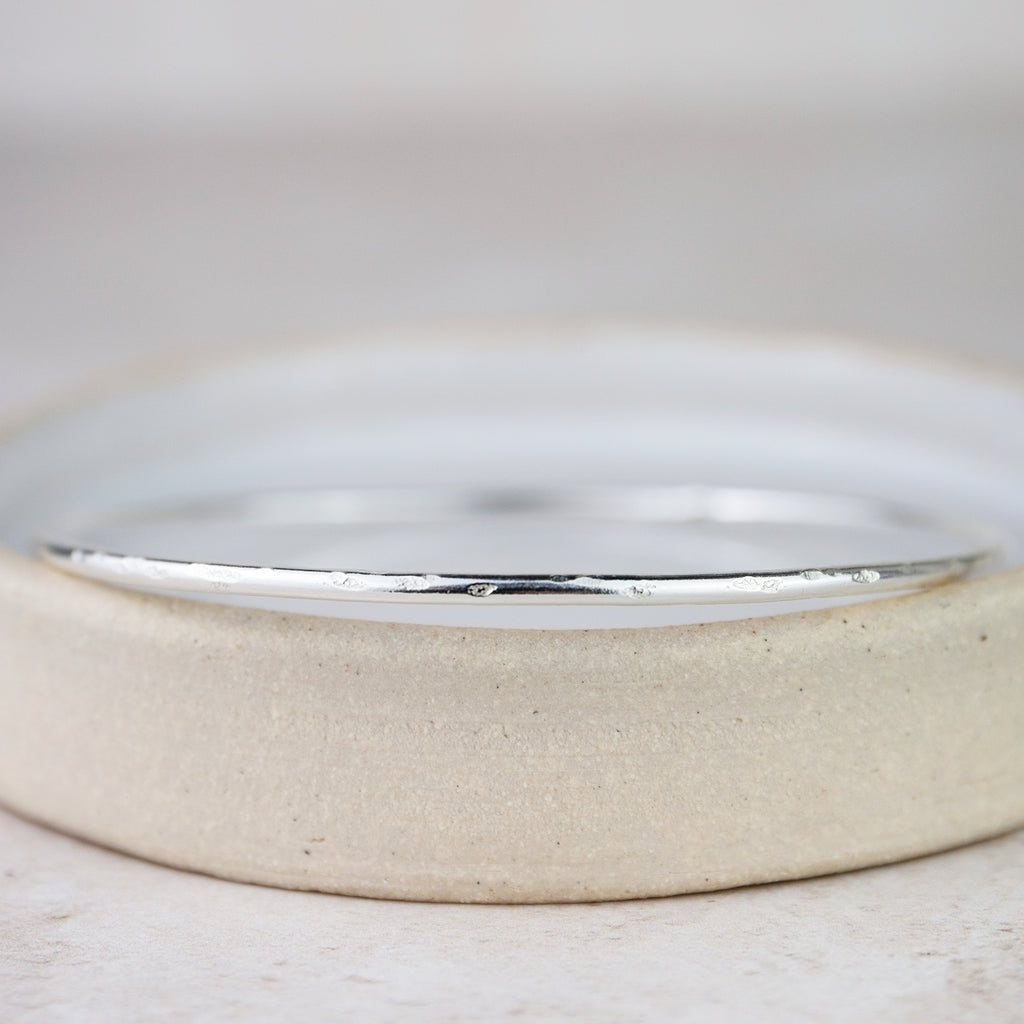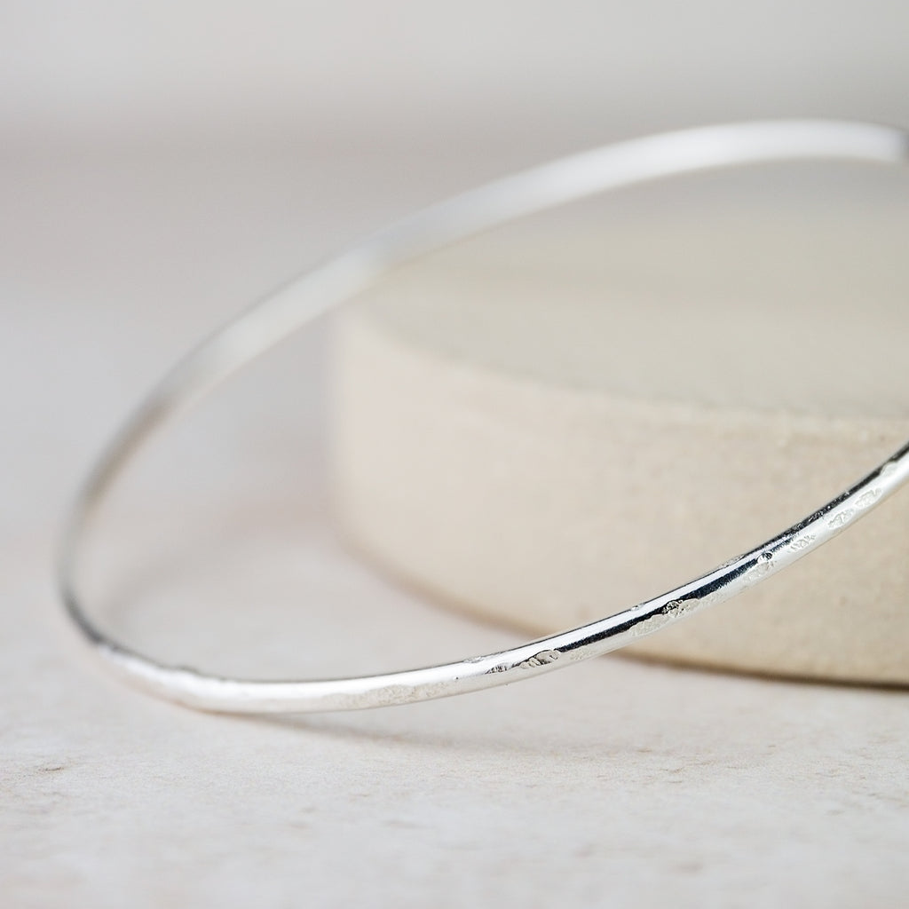 This stunning bangle is circle shaped and sits nicely stacked with all of our other bangles. The sterling silver bangle wire is approximately 2mm thick, and has a lightly hammered finish.