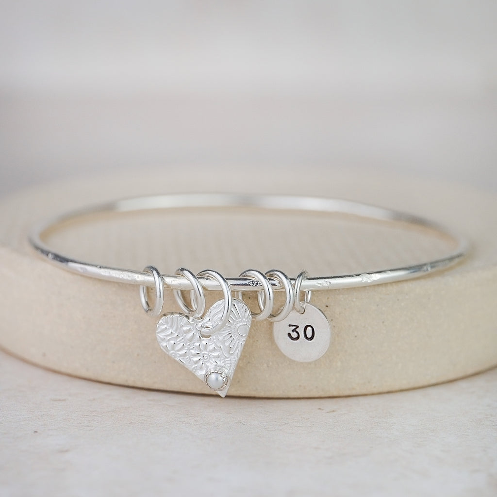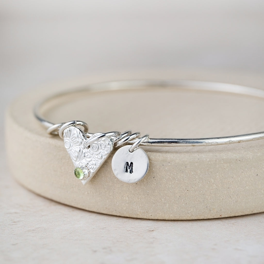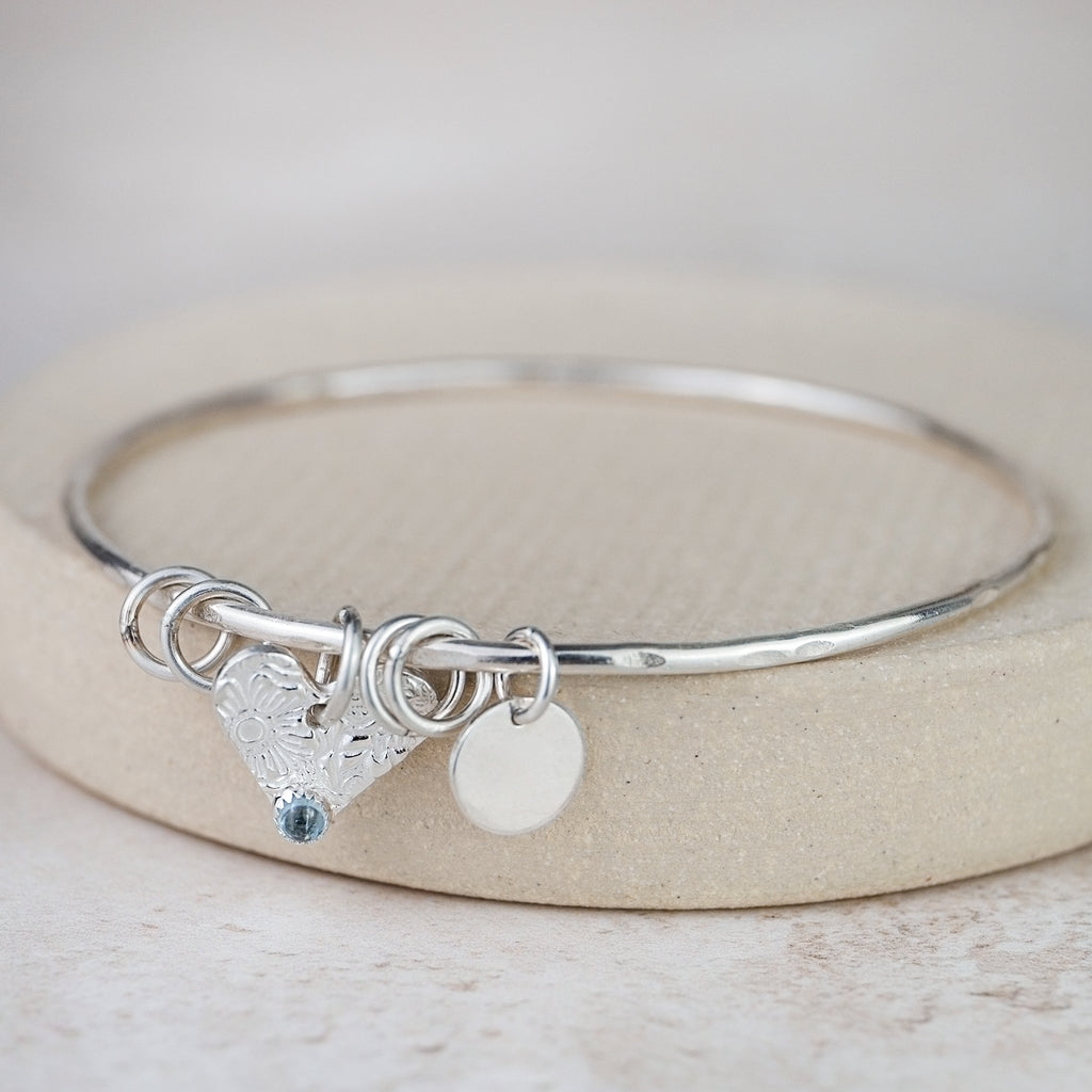 PJG This bangle is so pretty with the charms and birth stone, it goes well with the other 2 bangles to wear together.