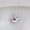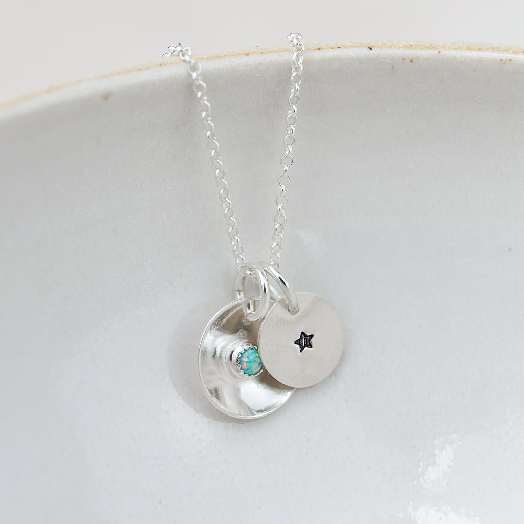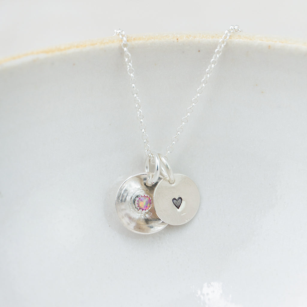 Each sterling silver pendant is hand cut and each semi precious birthstone is hand set into the sterling silver dome shaped pendant. You can have any of the twelve month birthstones, or alternatively we also have the choice of Labradorite, Amazonite, Blue, Green, Teal, Pink and Purple Opalite and Rose Quartz stones.