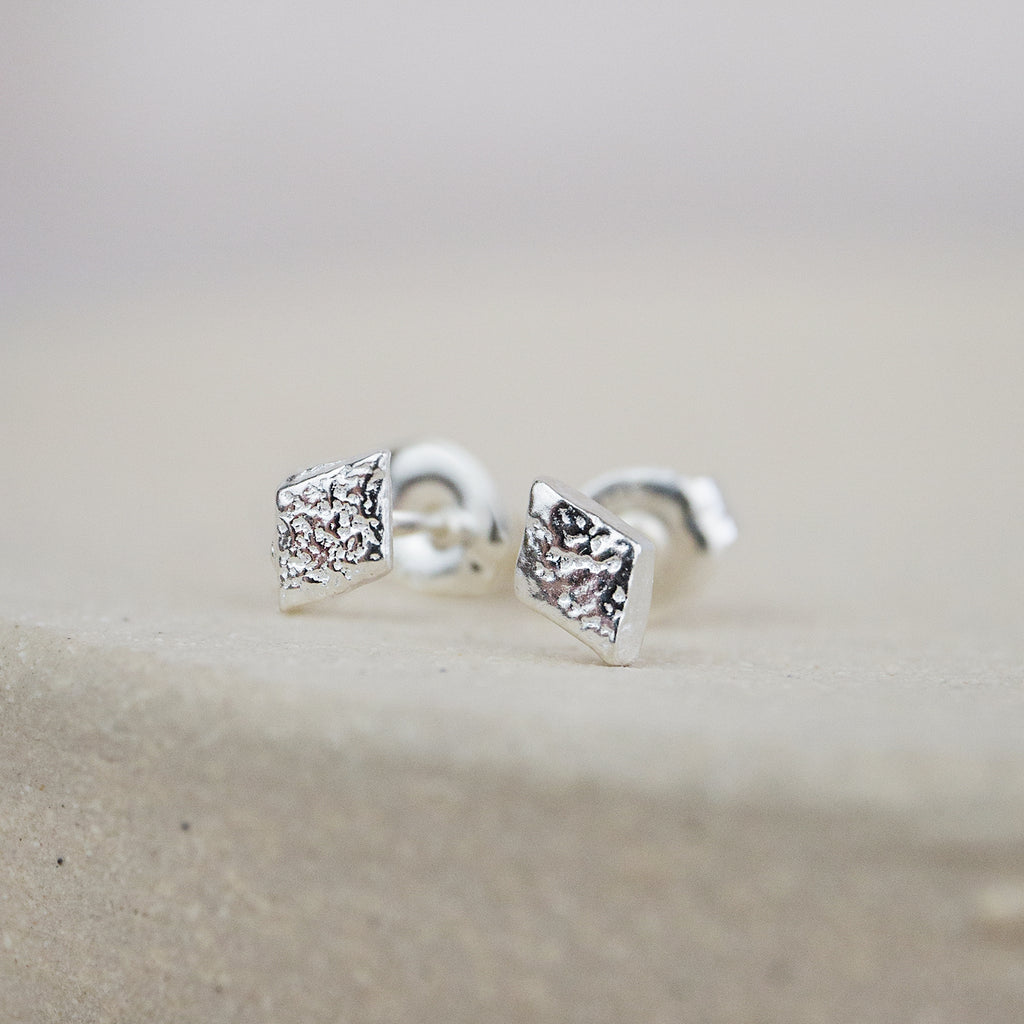 Handmade sterling silver mini diamond studs are hand cut and delicately textured and are perfect for everyday wear.