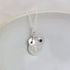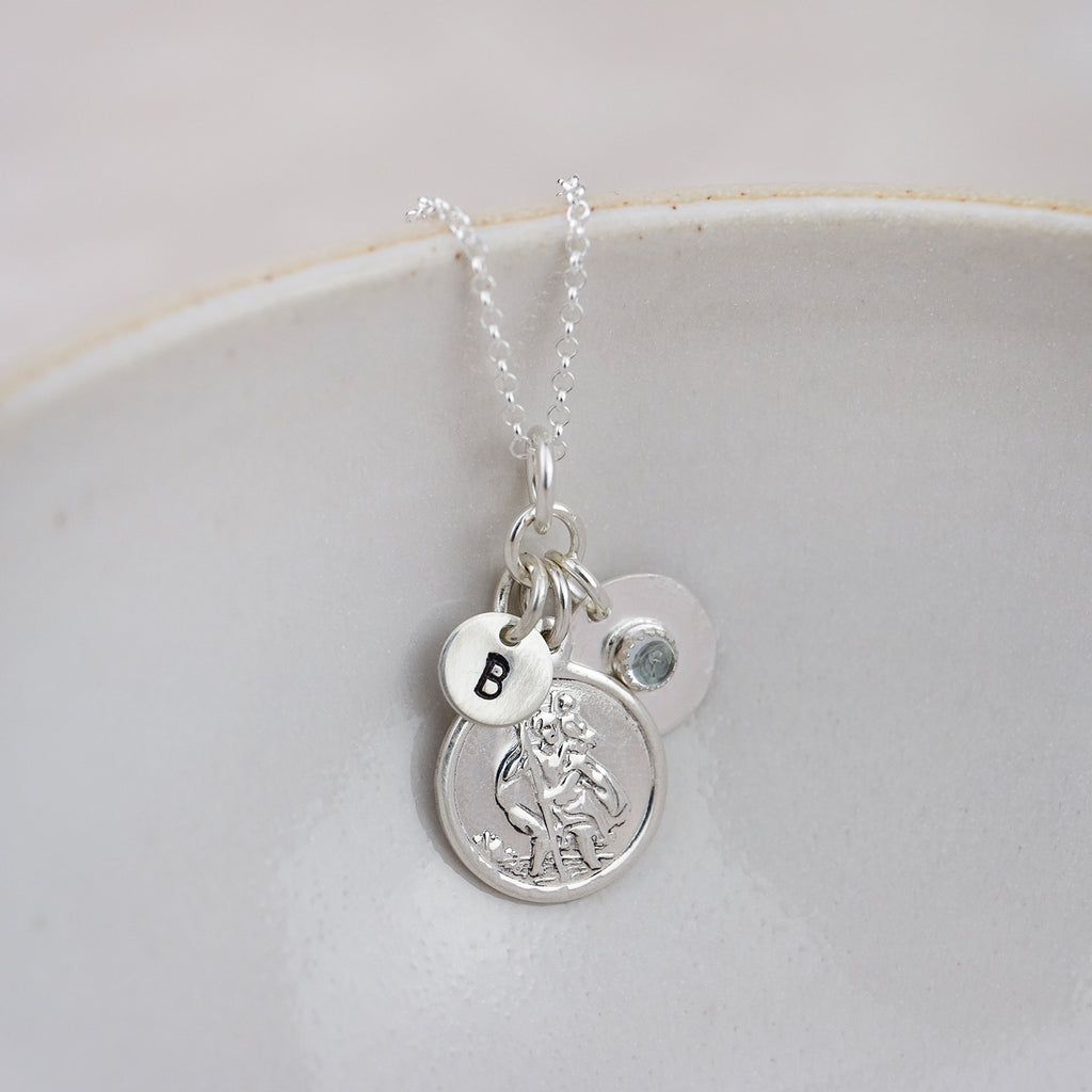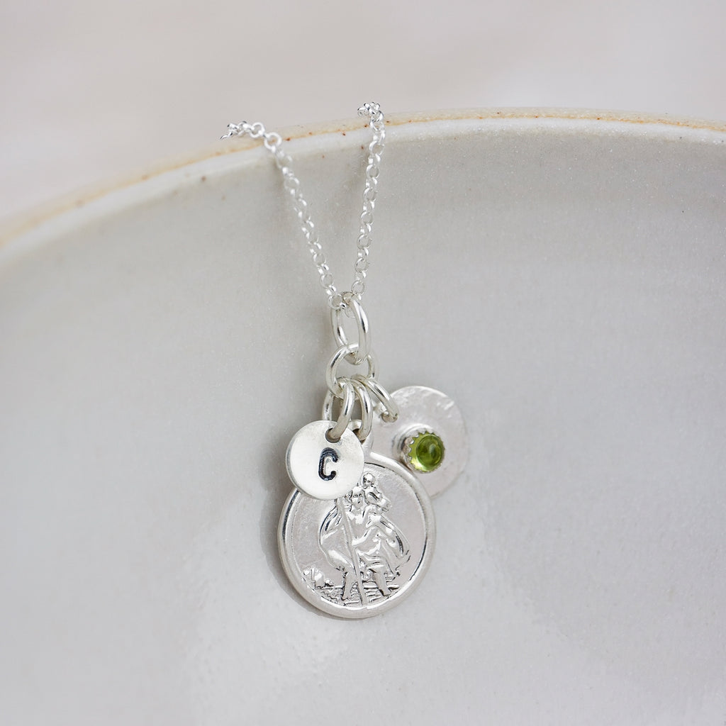 The first is a 13mm sterling silver St Christopher pendant. The second charm is a 10mm sterling silver round disc charm with a 3mm semi precious birthstone set in the middle. You can have any of the twelve month birthstones, or alternatively we also have the choice of Labradorite, Amazonite, Blue, Green, Teal, Pink and Purple Opalite and Rose Quartz stones. The third and final charm is a small 6mm sterling silver disc, this can have one initial hand stamped on it to make it even more individual.