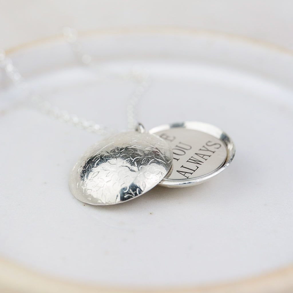 Each sterling silver domed part of the locket is 20mm across and has a delicate floral texture to the outside, closing around the hidden message inside. All finished with a sterling silver jump ring holding it together at the top.